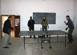 | Le Directeur M. Mabrouqi joue au ping-pong avec Guillaume et Laure, deux Azekkis en visite, et Kamal de l'assoc. Al Ikhlasse (merci Jean-Yves pour les raquettes et balles ;) |